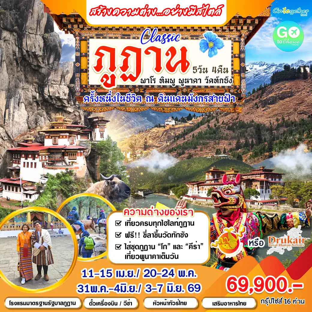 ทัวร์ภูฏาน 5 วัน สัมผัสดินแดนแห่งความสุขที่ Bhutan เที่ยวครบไฮไลต์เมือง Paro Thimphu และ Punakha พิชิตวัดศักดิ์สิทธิ์ Tiger’s Nest Monastery แลนด์มาร์กระดับโลก ชมธรรมชาติเทือกเขาหิมาลัย วัฒนธรรมมังกรสายฟ้า พร้อมใส่ชุดประจำชาติ “โก” และ “คีร่า” เก็บภาพความประทับใจ เที่ยวครบ จบในทริปเดียว เหมาะสำหรับสายธรรมชาติ สายบุญ และผู้ที่มองหาประสบการณ์ต่างประเทศที่ไม่เหมือนใคร