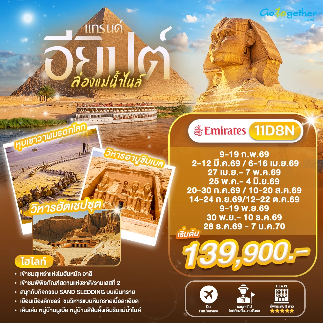 นำท่านไปค้นพบ ดินแดนไอยคุปต์ หนึ่งในจุดหมายปลายทางที่น่าตื่นเต้นสำหรับนักเดินทางที่หลงใหลในประวัติศาสตร์และวัฒนธรรม อารยธรรมโบราณที่น่าทึ่ง เป็นแหล่งรวมสิ่งมหัศจรรย์ของโลกยุคโบราณ สถานที่ท่องเที่ยวหลากหลาย พบประสบการณ์ที่ไม่เหมือนใคร เช่นการขี่อูฐชมพีระมิด, ล่องเรือในแม่น้ำไนล์, และสัมผัสวัฒนธรรมอาหรับแท้ๆ เป็นประสบการณ์ที่หาไม่ได้จากที่อื่น รวมถึงอาหารที่มีเอกลักษณ์ หนึ่งในเส้นทาง 7 สิ่งมหัศจรรย์ของโลก…ทัวร์อียิปต์