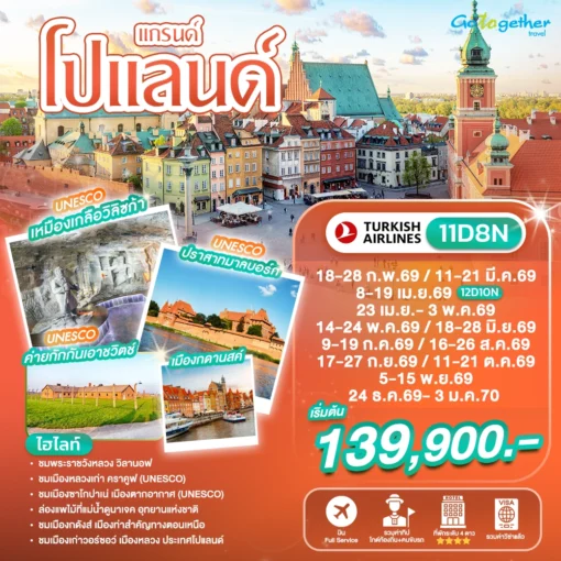 ทัวร์โปแลนด์ มนต์เสน่ห์แห่งยุโรปที่ซ่อนเร้น ชมสถานที่ท่องเที่ยวสวยงาม พระราชวัง ป้อมปราการ และที่เที่ยวระดับ Unseen มากมาย เรียนรู้ประวัติศาสตร์ระดับตำนานสมัยสงครามโลก เยี่ยมชมเมืองมรดกโลก UNESCO ชื่อดังอย่าง วอร์ซอ โทรุน และคราคูฟ พร้อมลิ้มลองอาหารเลิศรส อีกหนึ่งเส้นทางทัวร์ยุโรปที่ไม่ควรพลาด