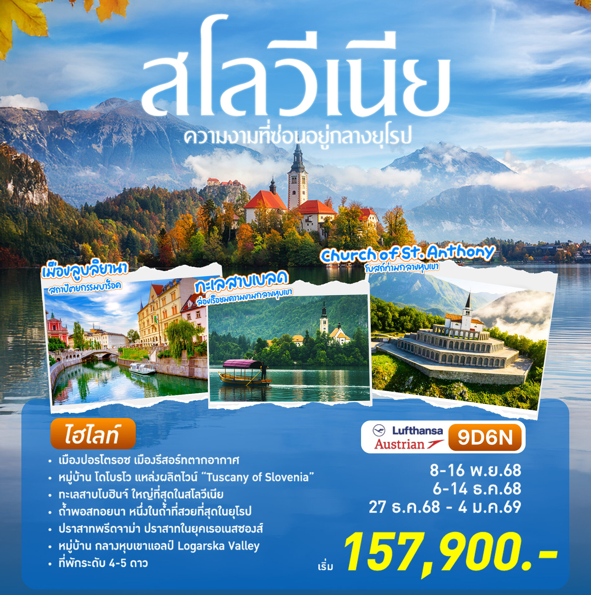 เยือนดินแดนแห่งธรรมชาติสุดอลังการ ดินแดนแห่งโลกนิยายกับ ทัวร์สโลวีเนีย ประเทศที่ซ่อนที่เที่ยวสวยงามไว้มากมายเกินกว่าจะจินตนาการ เก็บครบไฮไลท์ตลอดเส้นทาง อีกหนึ่งเส้นทางยุโรปที่ไม่ควรพลาดไปเยือนสักครั้ง กิจกรรมมากมายตลอดช่วงเดินทางทั้ง ชิมไวน์ ล่องเรือชมทะเลสาบ ล่องเรือชมเมือง พักผ่อนท่ามกลางธรรมชาติ หรือเมืองรีสอร์ทพักผ่อน ครบจบในโปรแกรมเดียว